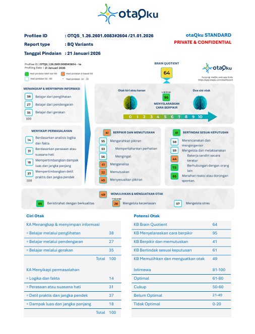 Akhirnya, otaQku Standard 4.0 mengubah tumpukan data teknis menjadi sebuah peta perjalanan yang utuh. Ia memberi Anda kejelasan tentang bagaimana pikiran Anda bekerja dan membantu Anda menentukan langkah yang paling tepat untuk menjalani hidup dengan lebih terarah. Memahami otak kini bukan lagi soal deretan angka, melainkan soal memahami arah hidup yang lebih bermakna.
